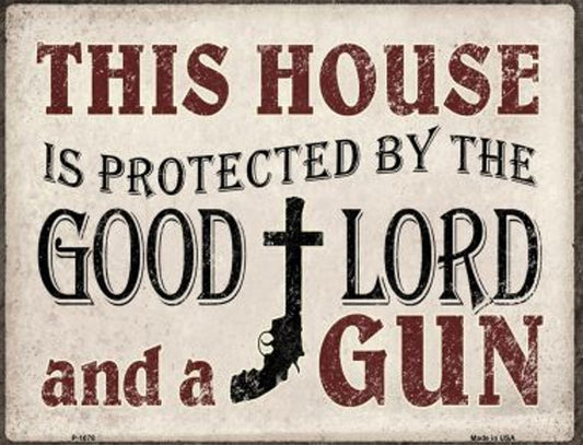 Protected By The Lord And Gun Aluminum Metal Parking Sign
