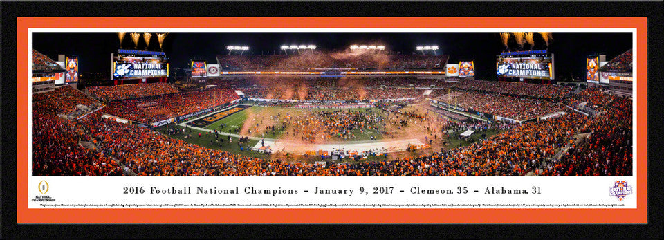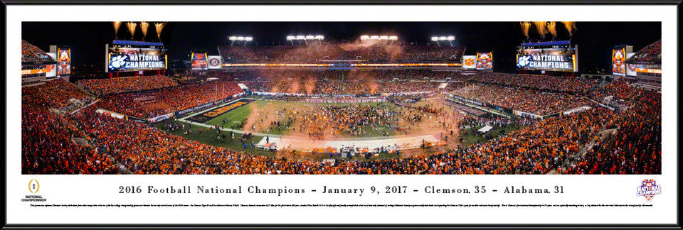 This panorama captures Clemson's victory celebration from what many claim to be one of the best college championship games ever between the two top ranked teams of the 2016 season - the Clemson Tigers® and the Alabama Crimson Tide®. Clemson claimed consecutive ACC titles for the first time in 28 years, crushed Ohio State® 31-0 in the playoffs and finally accomplished what most have only dreamed of, ending Alabama's twenty-six game undefeated streak and upending the Crimson Tide's quest for another national championship. This is Clemson's first national championship in 35 years, and an especially rewarding victory, as they claimed the title over rival Alabama in this championship title rematch.