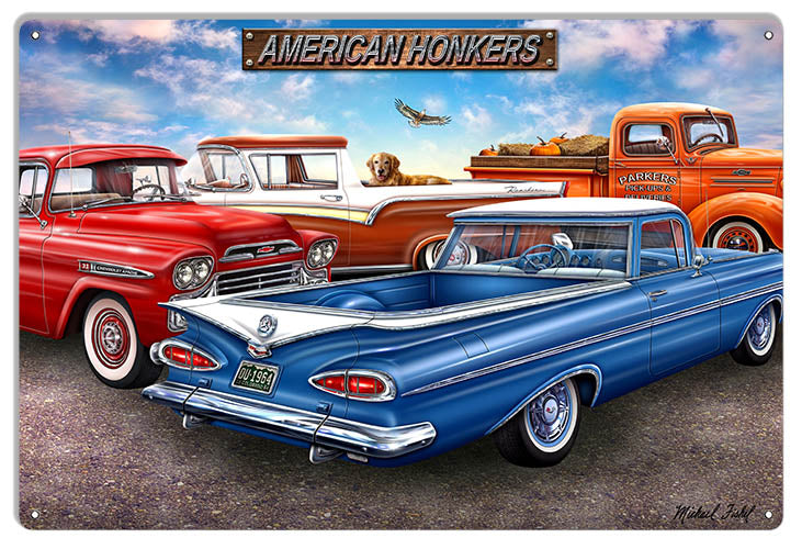 Celebrate classic American rides with the American Honkers Metal Sign by artist Michael Fishel. Proudly made in the USA, this 12" x 18" sign is crafted from durable 0.40-gauge aluminum and includes predrilled holes for easy hanging. A must-have for car lovers, this vibrant piece adds vintage auto flair to garages, dens, and more.