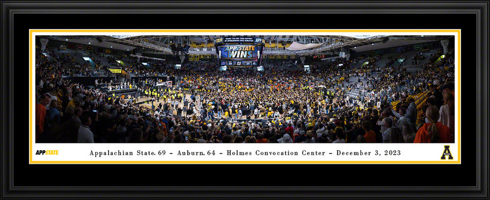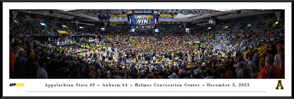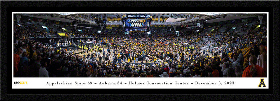 This panoramic photo, taken on December 3, 2023, captured the jubilation in Holmes Convocation Center in Boone, North Carolina as App State fans stormed the court after a resounding 69-64 victory over the Auburn Tigers. The record-breaking crowd of 7,037 witnessed one of the Mountaineers most memorable victories as App State claimed just their third win over an SEC school in program history and they did it during their first nationally televised game since the Holmes Convocation Center opened in 2000.