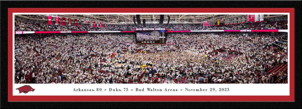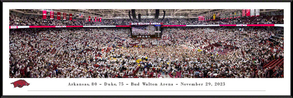 This panoramic photo, taken on November 29, 2023, captured the jubilation in Bud Walton Arena as the Arkansas Razorback fans stormed the court after a resounding 80-75 victory over the #7 Duke Blue Devils. The record-breaking crowd of 20,344 witnessed one of the Hogs most memorable home victories ever, in this white-out themed game. This season commemorates two milestone 30th anniversaries for Arkansas basketball, the first being the 1994 NCAA championship where Arkansas defeated Duke 76-72 to earn the national title, and the second being the 30th anniversary of the first game played in Bud Walton Arena, on this exact date, November 29.